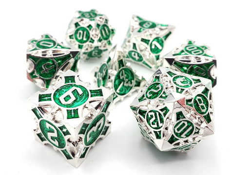 Old School Dice Gnome Forged Silver with Green Metal Poly 7 Set
