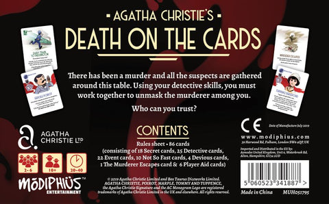 In Agatha Christie: Death on the Cards, which consists of a deck of eighty cards, players work co-operatively to solve a murder, using their detective skills to unmask the culprit and prevent their escape. The twist is that one of the players is the murderer and must work against the group to keep themselves hidden. Players also have dark secrets from their past they want to keep hidden from the other players. Who can you trust?
