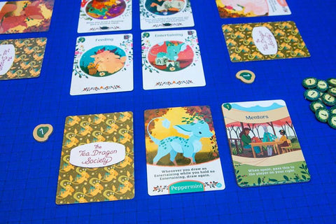 Each player's deck represents their own Tea Dragon. From turn to turn, players will choose to draw a card, triggering effects and strengthening their position, or buy a card, improving their deck or scoring points. At the end of the game, the player with the most points wins!