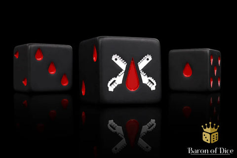 These contain a base of matte black, grim and unnerving, and inlaid with a two-toned crisp white skull and red blood drop; hand-swirled resin dice. The symbols are on the 6 side. These dice have an option of round corner, square corner or 12mm mini; choose wisely! Our premium dice now come in a unique reusable tin.