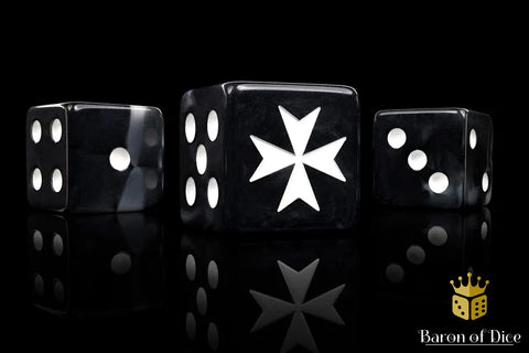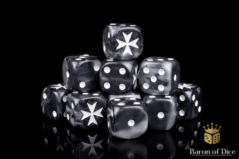 These contain a mix of gallant greys swirled with veins of faultless whites and inlaid with a honest white; resin matte 16mm dice. The symbols are on the 6 side. These dice are matte finish. Our dice come in round corner or square corner or 12mm, mini; choose wisely! Our premium dice now come in a unique reusable tin.
