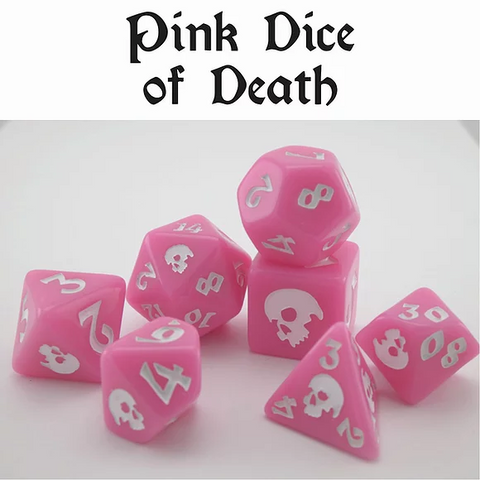 The Black Death has arrived! This 7 dice polyhedral set (standard RPG set) are sized up to match our 19mm d6s, so they are a handful of death! These come in two variations: The Great Black Death and the Pink Dice of Death. Each of the dice features a deathly skull design on the max face (other than the d4) to go with the theme. Be sure to check out the matching Black Death dice bag!