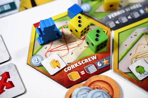 Dice Theme Park is a dice manipulation board game, all about creating and running your own park of fairground attractions.