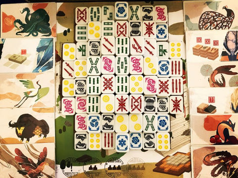 Dragon Castle is a game freely inspired by Mahjong Solitaire. During your turn, you take a pair of identical tiles from the central "castle" (known as the Dragon Castle) and place them on your own realm board to build your own castle. From time to time, you may sacrifice these tiles to acquire shrines in their place.