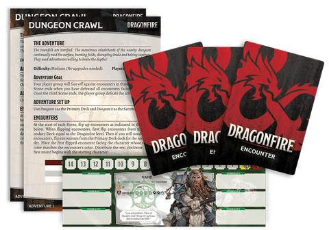 Dragonfire is a cooperative deck-building game set within the world of Dungeons & Dragons. Players choose from a number of races — from dwarf to elf, half-orc to human — while assuming the quintessential roles of cleric, rogue, fighter, and wizard. Equipped with weapons, spells, and magic items, players begin their adventure along the famed Sword Coast, then expand to other locales across the Forgotten Realms, such as Baldur's Gate, Neverwinter, and Waterdeep in future expansions. Along the way, players level up their characters, opening access to additional equipment, feats, and more. Join the quest, and build your own legend!