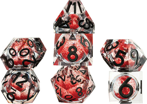 In 2023, FanRoll was the first company to bring liquid core dice to the mass market. This year, we are proud to bring this cutting edge technology to Dungeons and Dragons with a unique set of dice for the most discerning collector. Unlock the essence of adventure with our Dungeons & Dragons Liquid Core 7-Die Set! Liquid Core dice are hand crafted and infused with glittery liquid cores that swirl when rolled. Each set is hand polished to keep their beautiful sharp edges.
