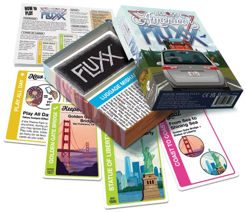 Across America Fluxx uses the basic gameplay of Fluxx, but now you're traveling across the United States of America to check out famous landmarks and national parks, from the Golden Gate Bridge to the Statue of Liberty, including the Grand Canyon, Hollywood, Cape Canaveral, Devil's Tower, the monuments of DC, and, of course, amusement parks. Across America Fluxx also includes a few special twists, including the new eule "Play All Day" and an action called "Route 66".