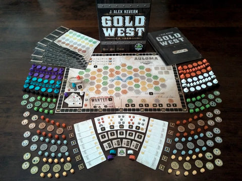 InGold West, players compete as prospectors building their mining empires while vying over the precious metals of the frontier. In a delicate balance of resource management and area control, players must plan their building strategies while carefully managing their supply tracks to refine the right resources at the most opportune times. Stay a step ahead of the competition and you could lead the West into the Golden Age.