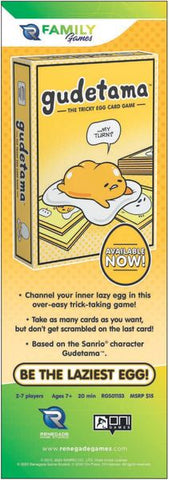 The Gudetama card game is a trick-taking game for 2-7 players where the goal is to avoid winning the final trick! The player who wins the final trick will score points equal to their card that won the trick (you do not want points). The Game is played over the course of several rounds, where each round consists of 7 tricks.