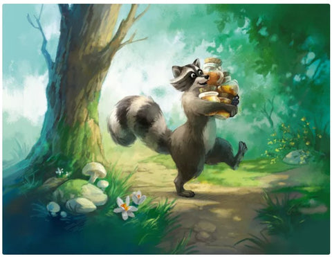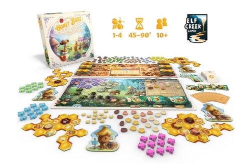 Honey Buzz is a worker bee placement game where players expand a personal beehive by drafting various honeycomb tiles that grant actions that are triggered throughout the game. Each tile represents a different action. Whenever a tile is laid so that it completes a certain pattern, a ring of actions is triggered in whatever order the player chooses. A tile drafted on turn one could be triggered up to three times at any point during the game. It all depends on how the player places their beeples (bee+meeple) and builds their hive. After all, in the honey business, efficiency is queen.