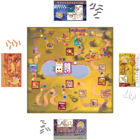 Over the course of several rounds in Imagineers, you must skillfully guide your guests around the park, earning money to build new attractions, which leads to happiness, which earns you fame! Careful choices about which rides to build — and when to upgrade your showcase roller coaster — will ultimately decide your success! The Imagineer who amasses the most fame wins!