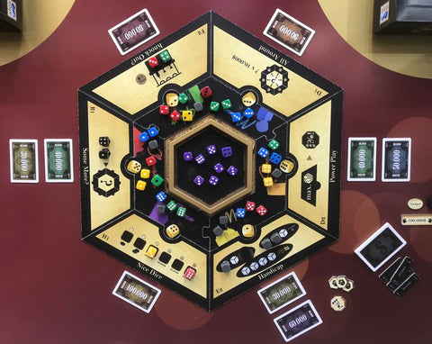 Each player has eight dice of a different color, which they take turns rolling. When you roll your dice, you can choose to place them on the relevant casino cards; for example, a die showing a 1 will be placed on the casino mat marked "1". You must place all dice of one number on one casino in your turn. All players take turns doing this until all the dice have been used. Finally, the player with the most dice on each casino card takes the highest-valued money associated with it, then the player with the secondmost dice takes the next highest-valued money card. In case of a tie, the non-tied player with the most dice takes the highest-valued money card at that casino, while the tied players get bupkis.