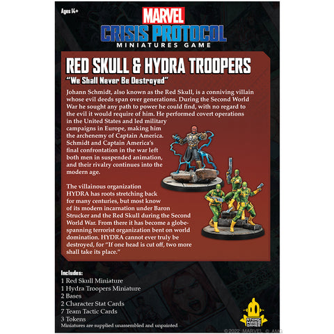 The Red Skull leads HYDRA in its quest for world domination in this new pack for Marvel: Crisis Protocol! Johann Schmidt is a conniving villain whose evil deeds span generations. During this time, he has transformed HYDRA into a globe-spanning terrorist organization that cannot ever truly be destroyed, for “If a head is cut off, two more shall take its place.” The new version of the Red Skull in this pack introduces the HYDRA Affiliation to Marvel: Crisis Protocol while leading a group of HYDRA Troops ready to do his bidding. In addition to these miniatures and their abilities, this pack further enhances the HYDRA Affiliation with seven Team Tactic cards that give Red Skull and his subordinates even more ways to further their plans for world domination.