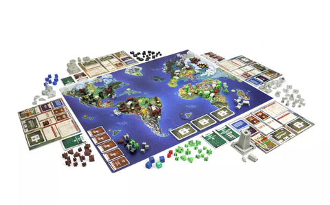You lead a civilization, and it is your mission to build your monument! The player who is the first to build all five layers of Machu Picchu, Tikal, the Colossus of Rhodes or the Pyramids will trigger the end of the game, but only the player with the most victory points will win! Conquer lands, produce goods, populate, train military units, build buildings, move your units, upgrade your action cards, trade, attack other players, draw quest cards and build your monument!