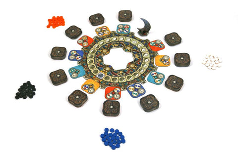 On each turn, you have to decide which new tile from the moon wheel to place in front of you. Every new tile brings a new task you have to fulfill. In order to do so, you need to place tiles of the correct color adjacent to the task you want to complete, but these of course again bring you new tasks. Each time a task is solved, you may place one of your markers on it. So decide wisely and be the first one to place all your markers.