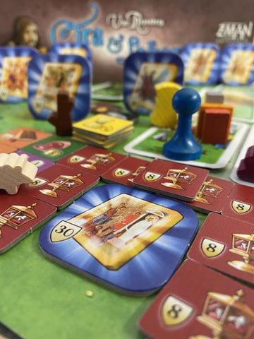 Each player has a personal game board. New buildings enter the game from time to time, and players can construct them on their game boards with the building materials they gather, with some terrain restrictions on what can be built where. Some spaces start with trees or moors on them, as in Agricola: Farmers of the Moor, so they hinder development until a player clears the land, but they provide resources when they are removed. Clever building on your personal game board will impact your final score, and players can buy additional terrain during the game, if needed.