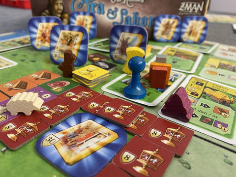 Players also have three workers who can enter buildings to take the action associated with that location. Workers must stay in place until you've placed all three. You can enter your own buildings with these workers, but to enter and use another player's buildings, you must pay that player an entry fee so that he'll move one of his workers into that building to do the work for you.