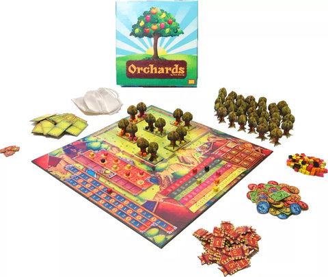 In Orchards, each player is trying to produce the best crop of fruit to sell at the market. They will need to plant, grow, harvest and sell at the right time to earn the most victory points.