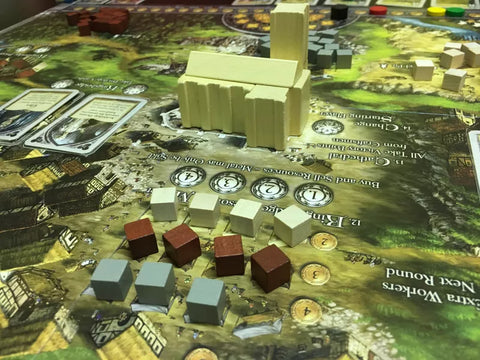 At the beginning of the 13th century, construction of the greatest and most beautiful cathedral in England begins. Players are builders who try to contribute the most to this cathedral's construction and, in so doing, score the most victory points. Gameplay roughly consists of using workers to produce raw materials, and then using craftsmen to convert the materials into victory points. Workers may also be used to produce gold, the currency of the game. Players are also given three master builders each turn, each of which can do a variety of tasks, including recruiting more workers, buying or selling goods, or just obtaining victory points. Getting early choices with a master builder costs gold, as does purchasing better craftsmen. Players must strike a balance between earning gold to fund their purchases and earning victory points.