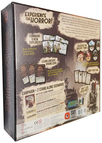 Robinson Crusoe: Mystery Tales introduces ten new characters, the new deck of event cards, three new decks of adventure cards, new beast cards, new mystery cards, and the new mechanism of sanity that you can use in the base game of Robinson Crusoe to change it into a game of dreadful stories! Additionally, the expansion includes five missions that form a long and epic campaign: "The Lost City of Z".