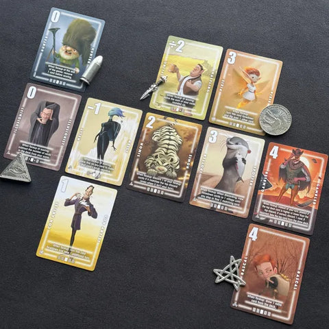 Silver Eyeis a fast and engaging traditional card game with a werewolf twist! Everyone starts the game with five face-down cards, with each player being able to choose and see two of their cards. Cards are numbered 0-13, with the number showing how many werewolves the character on that card attracts, and each character (number) has a different special power.