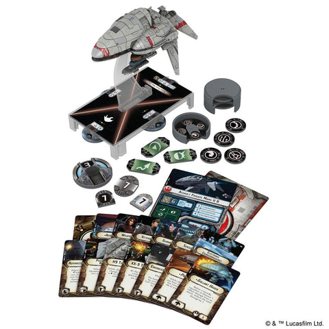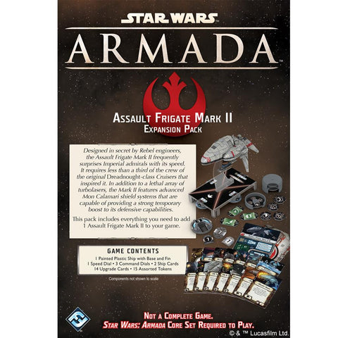 The largest and most heavily armed of the Rebellion's first wave of starships for Star Wars: Armada, the Assault Frigate Mark II is a light warship seven-hundred meters long that sports a crew just under five-thousand and features a considerable armament of fifteen turbolaser batteries, fifteen laser cannons, and twenty quad laser cannons. Designed in secret by Rebel engineers, the Assault Frigate Mark II frequently surprises Imperial admirals with its speed.The Assault Frigate Mark II Expansion Pack introduces one fully pre-painted Assault Frigate Mark II starship miniature, along with all the command dials and tokens that you need to bring it to battle. Two ship cards allow you to configure your Assault Frigate Mark II to better fit your fleet, and fourteen upgrade cards allow you to further refine its role within your fleet as you select your crew, upgrade your armament, and assign your commander.This is not a complete game experience. A copy of the Star Wars: Armada Core Set is required to play.