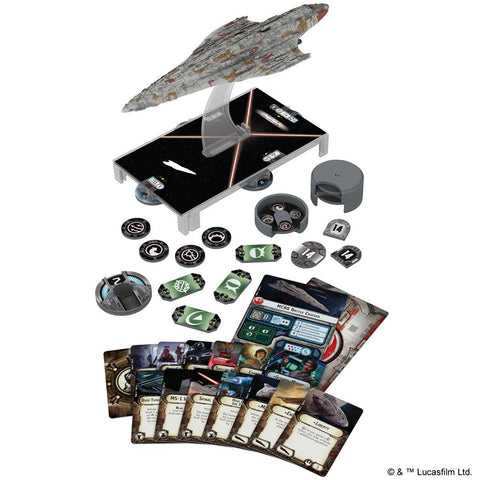 The MC80 Liberty type Star Cruiser is the spearhead of the Rebel Alliance's fleet, and it boasts some of the heaviest firepower in the Rebel arsenal. Its impressive firepower and powerful forward shielding, demand that it is often among the first ships considered to lead Rebel strike forces into combat.The Liberty Expansion Pack introduces the Liberty miniature as a large-base Rebel ship, as well as two ship cards, and fourteen upgrades, including a new commander and three unique Titles.
