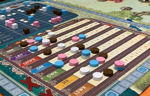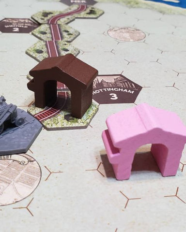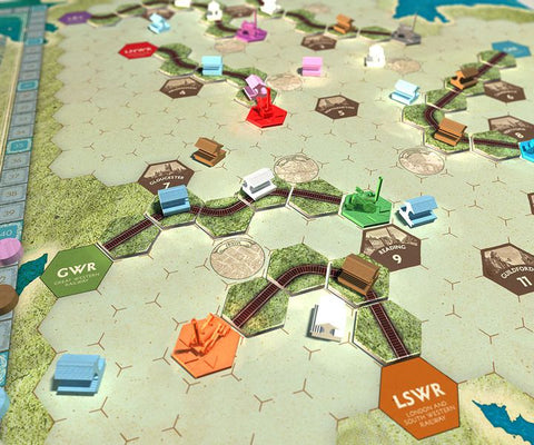 Reiner Knizia expands his fleet of tile laying games with this game about colliding railroads in early 1800's England. There are seven different rail companies that players can expand. Each time you extend a rail, the other stockholders can veto your action, but it might cost them their shares. When two companies' rail touch, the railways merge to become one. The game is over when only one company remains or there are no rail tiles remaining, and the winner is the player who earned the most money over the course of the game.