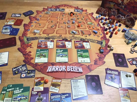 The goal of Terror Below is to be the first player to score 20 victory points (VP) by collecting worm eggs and delivering them to locations around town — or alternatively, by hunting down and killing those vicious worms.