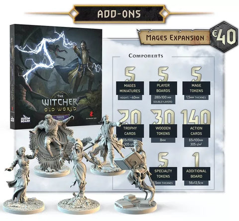 It includes 5 new characters – mages. Each has a unique miniature, a full set of components that include an individual deck and a player board with an individual specialty. With that expansion, you have 12 characters to choose from, and that’s not all. Mages get a board extension and a full deck of Action Cards. So mages and witchers can compete in the Old World, but they train and fight in their own style.