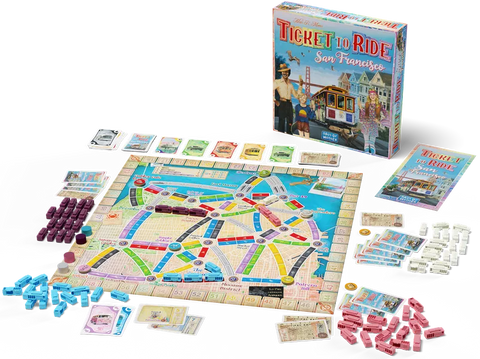 Ticket to Ride: San Francisco features the familiar gameplay from the Ticket to Ride game series — collect cards, claim routes, draw tickets — but on a map of 1960s San Francisco that allows you to complete a game in no more than 15 minutes.