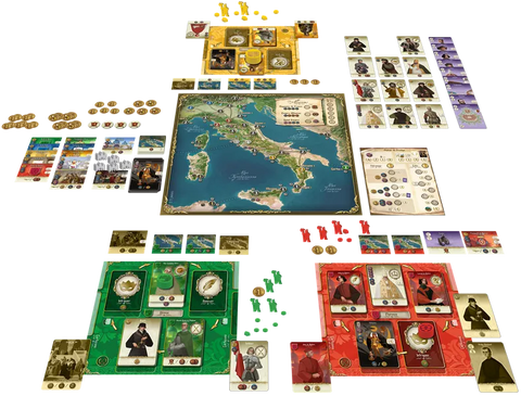 The foundation of the game is "wheelbuilding", that is, creating a "wheel of actions" on your personal player board, which has a unique arrangement compared to other players and with you having a different set of starting family cards. Depending on how you place the cards, you have multiple options available and a starting strategy, but you can acquire and place new cards to alter your approach over the course of the game. You interact with others indirectly by taking cards they want or racing to goals or directly by sending agents to the palace or their cities as well as by attacking cities. Artists, merchants, and diplomats can also work to increase your prestige.