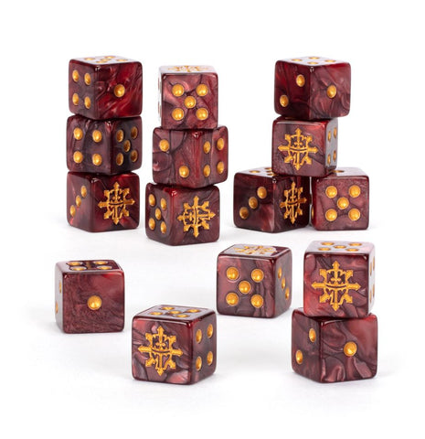 This set includes 15 six-sided, square-edged dice that measure 16mm along each edge. They are cast in two-tone pearlised red with pips in a metallic golden ink, and feature the Chaos Knights icon – a corrupted helm fused with an eight-pointed star – on the 6 face.